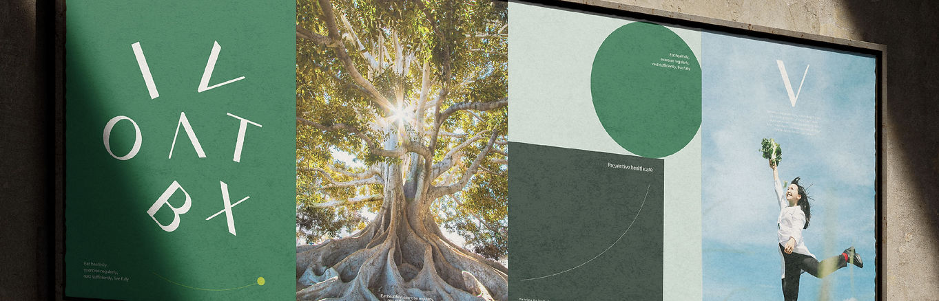 輔助圖形源於品牌 V 字延伸,結合「預防醫學」與「加乘效應」的箭頭意象,強化品牌識別性。這些圖形為品牌「平面設計」與數位應用提供靈活延展素材,提升設計統一感。